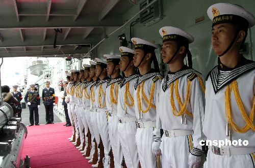 11月29日,中國“深圳”號導彈驅逐艦對日本的友好訪問進入第二天,雙方進行了高層拜訪、參觀軍艦、體育比賽等各種交流。圖為等待日本海上自衛(wèi)隊參謀長吉川榮治檢閱的“深圳”號艦上儀仗隊。中新社發(fā) 朱沿華 攝