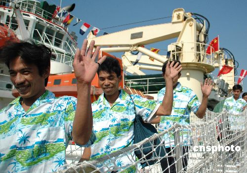 十一月三十日,中國(guó)“南海救一一二”和“南海一九九”兩艘救護(hù)船載著十名因受臺(tái)風(fēng)“海貝思”影響而被困南沙、西沙的中越漁民返回海南三亞,其中越南漁民七人,中國(guó)漁民三人。中新社發(fā) 尹海明 攝