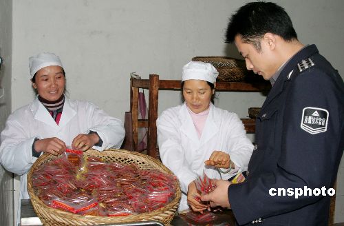 12月25日,質(zhì)量技術(shù)監(jiān)督工作人員在檢驗(yàn)即將出廠的食品。春節(jié)將至,以生產(chǎn)熟食鹵香干、咸豆腐等系列產(chǎn)品而聞名的湖南省新寧縣辣椒峰湘味熟食加工廠,嚴(yán)把食品生產(chǎn)質(zhì)量關(guān),生產(chǎn)出優(yōu)質(zhì)產(chǎn)品贏銷(xiāo)市場(chǎng),成為春節(jié)暢銷(xiāo)貨。中新社發(fā) 楊岸暉 攝