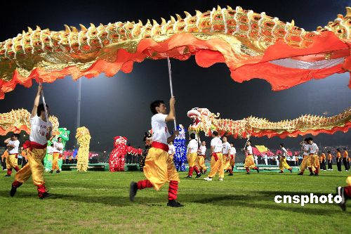 圖為現(xiàn)場龍獅齊武,中華自強之聲不絕于耳。