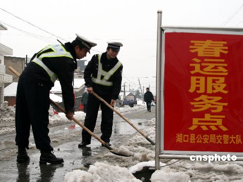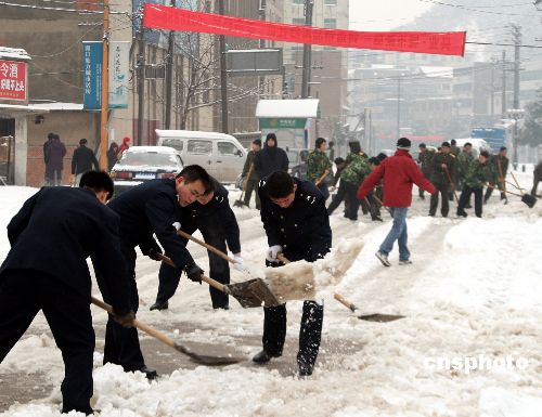 12月28日晚,江西省北部的湖口縣迎來(lái)入冬以來(lái)最大的一場(chǎng)雪。據(jù)悉,該縣已經(jīng)連續(xù)六天發(fā)布道路結(jié)冰紅色預(yù)警信號(hào),所有道路凝冰嚴(yán)重。1月29日,凝冰未化又遇小到中雪,通行能力受到挑戰(zhàn)。該縣民警、消防戰(zhàn)士、駐地部隊(duì)官兵、民兵應(yīng)急隊(duì)員和廣大黨員干部群眾二萬(wàn)余人上街清掃積雪和凝冰,盡最大努力減少災(zāi)害損失。中新社發(fā) 張 俊 攝