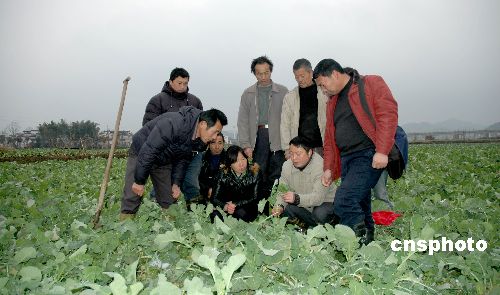 1月30日,農(nóng)技員在指導農(nóng)民為積雪后的油菜排水和傳授油菜防凍技術。29日江西婺源縣普降大雪,影響了當?shù)剞r(nóng)作物生長。當日婺源縣組織千名農(nóng)技員奔赴抗擊雪災一線,指導農(nóng)民對農(nóng)作物自救,使農(nóng)民損失降到最低。中新社發(fā) 王國紅 攝