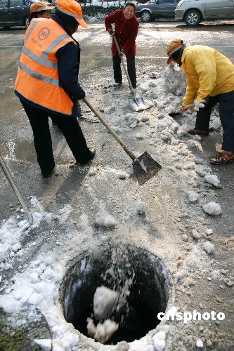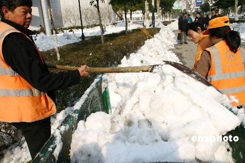2008年1月31日,環(huán)衛(wèi)工人在南京山西路廣場清理積雪。南京連續(xù)兩天放睛,街頭到處可見掃雪人,環(huán)衛(wèi)工人運(yùn)用各種辦法掃除公路兩邊、市民廣場和景區(qū)內(nèi)的積雪。受連續(xù)暴雪影響,南京城內(nèi)到處是堆積如山的白雪。中新社發(fā) 阿董 攝