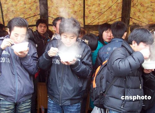 2月2日,上海站南廣場上的臨時(shí)候車棚里,“南京路上好八連”為民服務(wù)隊(duì)的官兵們帶著野炊用具為回鄉(xiāng)候車的旅客做飯。圖為候車旅客喝著“好八連”官兵燒的熱粥。中新社發(fā) 周東潮 攝