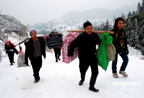近一個月來,廣西融水縣遭受當(dāng)?shù)亟?7年來最嚴(yán)重的雨雪冰凍災(zāi)害,在海拔1470米的摩天嶺,冰雪封凍導(dǎo)致交通中斷,當(dāng)?shù)刂泄颤h員每天為過往災(zāi)民義務(wù)帶路和挑擔(dān),幫助他們翻越冰雪覆蓋的摩天嶺,安全回家。中新社發(fā) 張耀華 攝
