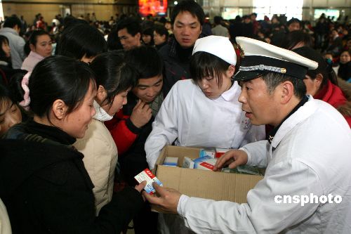 持續(xù)的大范圍災(zāi)害性雨雪天氣給回鄉(xiāng)過春節(jié)的旅客帶來不便。2月5日,中國海軍上海保障基地派出醫(yī)療隊,冒著嚴(yán)寒來到上海火車站免費為旅客送醫(yī)送藥。中新社發(fā) 穆東祥 攝