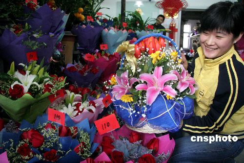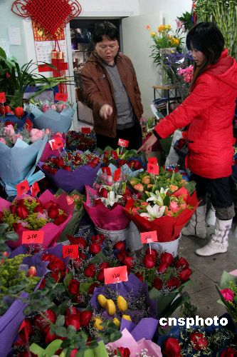 2月13日,顧客在挑選鮮花。為迎接“情人節(jié)”,山東威海各花店生意紅火,許多顧客為女友和母親訂購鮮花,鮮花市場銷售異常火爆,許多花店為此招臨時工幫忙。中新社發(fā) 海云飛 攝