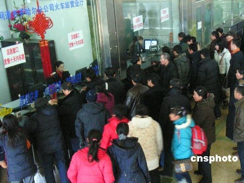 2月15日,人們?cè)邶R齊哈爾火車站售票大廳購(gòu)票。當(dāng)日,齊齊哈爾火車站在探親返城客流和農(nóng)民工客流出現(xiàn)高峰后,又迎來(lái)學(xué)生客流高峰,日送來(lái)往旅客達(dá)2.5萬(wàn)人。為緩解購(gòu)票難,車站增加了應(yīng)急售票窗口,車站派出所派出警力24小時(shí)巡查,并在廣場(chǎng)設(shè)置一臺(tái)報(bào)警服務(wù)車,隨時(shí)為旅客提供服務(wù)。 中新社發(fā) 王云龍 攝