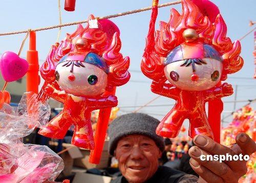 元宵節(jié)臨近,2月15日,在山東棗莊山亭區(qū)農村大集上,與奧運主題相關的居室飾品、時尚花燈等商品備受人們青睞,“奧運經濟”格外火爆。中新社發(fā) 劉明祥 攝