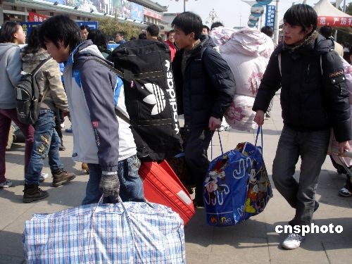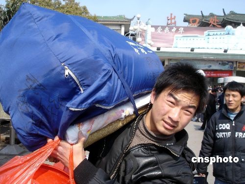 2月17日,返蘇民工扛著包裹從蘇州火車站走出。近日,外來務(wù)工人員返回蘇州呈現(xiàn)高峰,蘇州火車站客流量明顯上升。據(jù)悉,蘇州火車站平均日接收外來民工達(dá)3萬余人。中新社發(fā) 王建康 攝