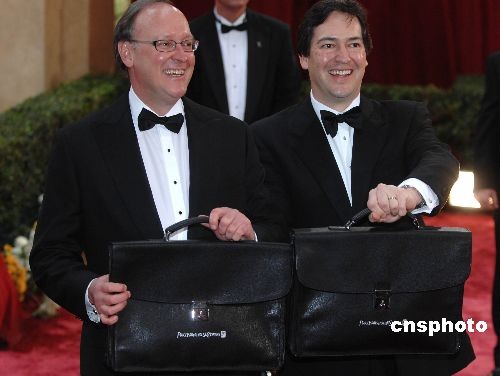 當?shù)貢r間2月24日晚,第八十屆奧斯卡頒獎典禮在好萊塢柯達劇場舉行。在奧斯卡金像獎頒獎典禮開始前,美國普華永道會計事務所的兩位會計師布萊德(左)和瑞克向記者展示兩個公文包,這里裝的就是奧斯卡各獎項的最終結果。兩位會計師是最早知道奧斯卡結果的人。中新社發(fā) 張煒 攝