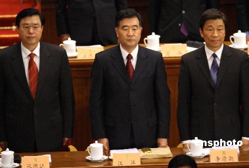 3月3日下午,全國(guó)政協(xié)十一屆一次會(huì)議在北京人民大會(huì)堂開幕,中共中央政治局委員李源潮、汪洋、張德江(從右至左)出席。中新社發(fā) 任晨鳴 攝
