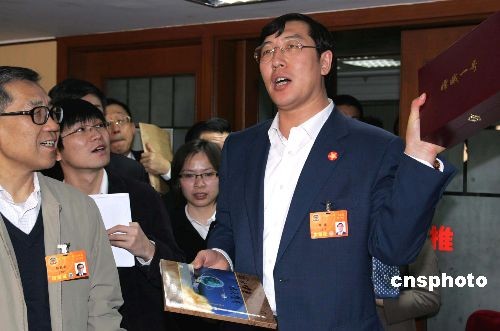 三月四日,在全國政協(xié)小組討論會(huì)上,政協(xié)委員、億陽集團(tuán)董事長鄧偉向委員們贈(zèng)送“嫦娥一號”模型。中新社發(fā) 潘索菲 攝