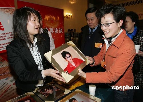 三月八日,政協(xié)女委員楊俊在北京人民大會(huì)堂意外收到裝幀精美的個(gè)人玉照。她表示,這是收到的“三八婦女節(jié)”最驚喜的禮物。原來(lái),人民網(wǎng)將采訪過(guò)的兩會(huì)女代表委員照片放大制作成相框,“三八”這天在大會(huì)堂免費(fèi)贈(zèng)送其本人,頗令她們驚喜。中新社發(fā) 潘索菲 攝