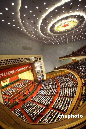 3月11日下午,十一屆全國(guó)人大一次會(huì)議在北京人民大會(huì)堂舉行第四次全體會(huì)議,聽取國(guó)務(wù)委員兼國(guó)務(wù)院秘書長(zhǎng)華建敏關(guān)于國(guó)務(wù)院機(jī)構(gòu)改革方案的說明。中新社發(fā) 任晨鳴 攝