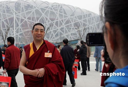 三月十二日下午,部分全國(guó)政協(xié)委員參觀北京奧運(yùn)場(chǎng)館。圖為全國(guó)政協(xié)委員、青海省佛教協(xié)會(huì)副會(huì)長(zhǎng)拉茂賽赤活佛,在北京奧運(yùn)會(huì)國(guó)家體育場(chǎng)“鳥巢”前請(qǐng)人拍照留影。中新社發(fā) 潘索菲 攝