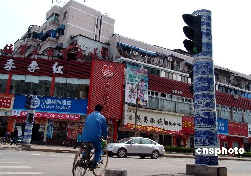3月20日,“清明上河圖”瓷器紅綠燈亮相景德鎮(zhèn)市街頭。該燈為白底青花圖案,畫面內(nèi)容是清明上河圖,直徑0.5米,高4.2米。樹立在在景德鎮(zhèn)新廠的瓷器紅綠燈不但能指揮交通,美化城市,同時正逐漸成為景德鎮(zhèn)鮮明的瓷文化標志符號之一。中新社發(fā) 石衛(wèi)明 攝
