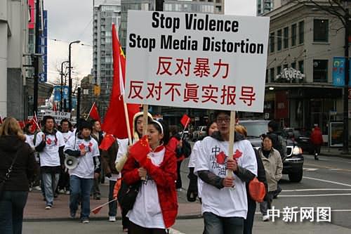 當(dāng)?shù)貢r間29日下午,加拿大溫哥華部分中國留學(xué)生和華人代表組織“反暴力,反媒體對西藏事件失實報道”集會活動。中新社記者呂振亞攝