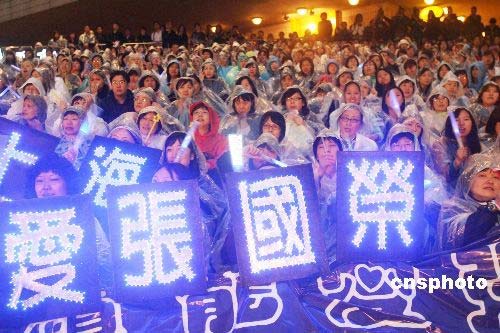 三月三十一日,香港文化中心舉行Live Moments·張國榮拉闊時光露天播放會,紀念張國榮逝世五周年。圖為觀眾在雨中觀看影片。中新社發(fā) 武仲林 攝