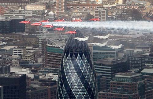 英國(guó)皇家空軍4月1日舉行飛行表演,“紅箭”飛行表演隊(duì)的飛機(jī)和4架“臺(tái)風(fēng)”戰(zhàn)機(jī)飛過倫敦上空,紀(jì)念皇家空軍建立90周年。
