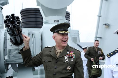4月2日,美國(guó)海軍陸戰(zhàn)隊(duì)司令詹姆斯·康威上將一行開始對(duì)中國(guó)南海艦隊(duì)進(jìn)行為期2天的參觀訪問。南海艦隊(duì)副參謀長(zhǎng)么志樓少將下午陪同康威上將前往湛江軍港,登上中國(guó)海軍“武漢”號(hào)導(dǎo)彈驅(qū)逐艦和“羅霄山”號(hào)登陸艦參觀?低d致勃勃地參觀了艦艇指揮作戰(zhàn)室、駕駛室和艦載武器等核心部位,聽取了解說員對(duì)艦艇有關(guān)性能的介紹?低䦟(duì)中國(guó)軍隊(duì)的開放程度、透明程度和現(xiàn)代化程度表示稱贊。圖為康威上將參觀“武漢”號(hào)導(dǎo)彈驅(qū)逐艦30炮,該軍艦是中國(guó)自行設(shè)計(jì)建造的新型現(xiàn)代化軍艦。中新社發(fā) 李唐 攝