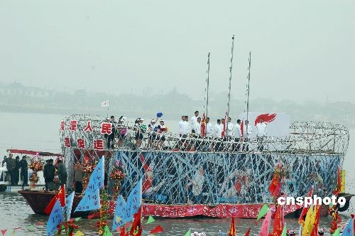 4月6日,第三屆中國濕地生態(tài)旅游節(jié)暨2008中國姜堰·溱潼會船節(jié)在江蘇省姜堰市溱湖風(fēng)景區(qū)開幕。當(dāng)?shù)厝罕娤驍?shù)十萬中外來賓再現(xiàn)了“天下第一會船”的盛況。會船節(jié)上展示的“鳥巢”貢船迎奧運(yùn)吸引了眾多觀眾的眼球。中新社發(fā) 楊素平 攝
