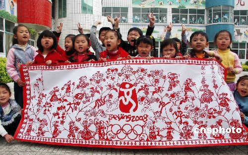 4月7日,幼兒園的小朋友在參觀《華夏兒女喜迎奧運圣火》剪紙作品。近日,河南周口軍分區(qū)幼兒園老師陳雪英用兩周的時間加班制作出了一幅《華夏兒女喜迎奧運圣火》的剪紙作品。據(jù)了解,該作品邊長2.3米,寬0.75米,畫面上刻有福娃、五環(huán)、火炬、和平鴿和各民族娃娃,整幅作品用國花牡丹連接而成,四周是一百多個火炬,象征著奧運圣火在全世界巡回傳遞,整幅作品表達了華夏各族兒女喜迎奧運圣火的歡樂情景。中新社發(fā) 楊正華 攝