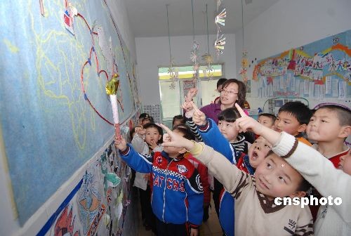 4月8日,山東濰坊市奎文區(qū)新華幼兒園師生正在自己親手制作的奧運圣火線路圖前,喊出對圣火的祝福。令世人矚目的奧運圣火傳遞,同樣也牽動著孩子們的心,山東濰坊市奎文區(qū)新華幼兒園的孩子們在老師的指導(dǎo)下制作了一面“奧運墻”,內(nèi)容有奧運圣火的傳遞路線,還有奧運會運動項目圖解等,孩子們每天都關(guān)注著奧運圣火的傳遞,關(guān)注著奧運。作者: 王立軍