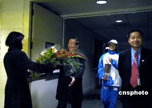 圖為北京奧組委執(zhí)行副主席蔣效愚和圣火護衛(wèi)員步出機艙,當?shù)厝A人獻花迎接。作者: 陳鋼