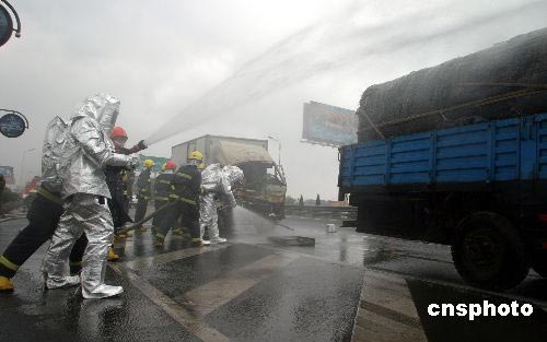 2008年4月9日,在濟青高速公路零公里處,山東省高速公路交警支隊聯(lián)合消防、醫(yī)療救護、環(huán)保等單位舉行了“迎奧運、保暢通”模擬交通事故救援演練。演練模擬在濟青高速公路零公里處,一輛油罐車與一輛貨車發(fā)生碰撞,油罐車起火,隨時都有爆炸的可能。而后面的貨車因猛烈撞擊,造成駕駛室嚴重變形,駕乘人員被困車內。山東省高速公路交警支隊接到報警后,迅速趕到現(xiàn)場進行處理,同時啟動重特大交通事故處置聯(lián)動機制,及時通知消防、醫(yī)療救護、環(huán)保等部門聯(lián)動,并在30分鐘內將火勢控控制,救治被困受傷人員,恢復車輛正常通行。作者: 龔輝
