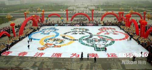 4月12日,愚公家鄉(xiāng)河南省濟(jì)源市千名小學(xué)生在濟(jì)源世紀(jì)廣場2008平方米的畫布上共同繪制巨型福娃,表達(dá)濟(jì)源市青少年學(xué)生對北京奧運會的向往和美好祝愿。中新社發(fā) 平白 攝