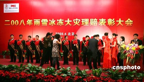 中國人民財產(chǎn)保險股份有限公司(PICC)在北京舉行2008年雨雪冰凍大災(zāi)理賠表彰大會,對該公司在此次大災(zāi)理賠工作中取得突出成績的單位(集體)和個人進行表彰。中新社發(fā) 楊可佳 攝