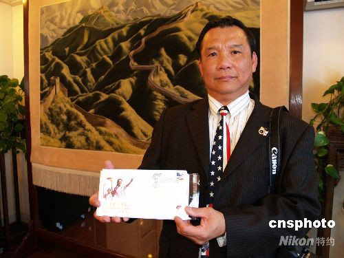 4月13日,美國(guó)郵政局發(fā)行“2008年北京奧運(yùn)圣火傳遞舊金山首日封”。這枚首日封由華人設(shè)計(jì)師魏進(jìn)發(fā)設(shè)計(jì)。中新社發(fā) 盧威 攝