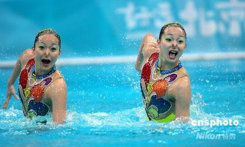 4月18日,“好運北京”2008花樣游泳奧運資格賽結(jié)束了雙人自由自選項目的爭奪,中國姐妹花蔣文文/蔣婷婷以總成績96.083的得分繼多哈亞運會之后再度擊敗日本名將鈴木繪美子/原田早穗,摘得銀牌。中新社發(fā) 富田 攝