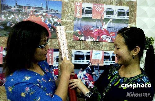 首棒火炬手、前奧運(yùn)游泳冠軍林莉(左)介紹祥云火炬的構(gòu)造。 陳鋼 攝