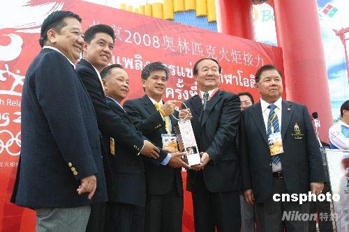 圖為曼谷市市長阿皮拉(左四)與北京奧組委執(zhí)行副主席蔣效愚(左五)共舉圣火燈。 沈晨 攝