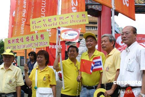 4月19日下午3時15分,祖籍中國海南的泰國第二代華裔阿南·詩里帕差臘蓬從曼谷市市長阿皮拉手中接過“祥云”火炬,北京奧運圣火在此間的傳遞正式開始。北京奧運圣火在曼谷的傳遞約10.8公里,共有80名火炬手,其中泰籍華人占一半以上;鹁孀蕴迫私种腥A門出發(fā)后,途經(jīng)臥佛寺、大王宮、民主紀(jì)念碑、集拉達(dá)王宮、阿南達(dá)王宮等曼谷著名景點后,最終在五世王銅像廣場舉行慶典儀式。圖為華人華僑在圣火傳遞沿途舉牌助威。 中新社發(fā) 沈晨 攝