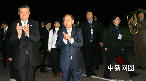 4月28日凌晨0時20分,載有北京奧運圣火的“奧運圣火號”平穩(wěn)地降落在平壤國際機場。朝鮮首都平壤是北京奧運圣火海外傳遞“和諧之旅”的第18站。這是奧運圣火自一九三六年開始傳遞活動以來,首次來到朝鮮。圖為北京奧組委執(zhí)行副主席李炳華(左二)與中國駐朝鮮大使劉曉明(左)在機場受到熱烈歡迎。沈晨 攝
