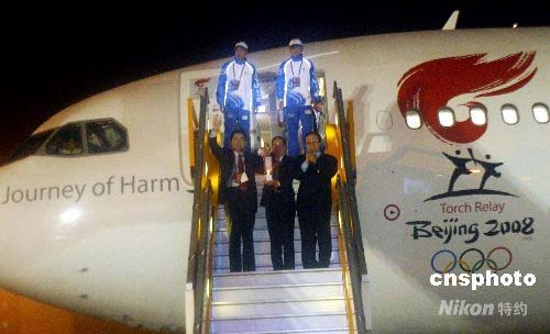 4月28日晚10時(shí)57分,載著北京奧運(yùn)圣火的“奧運(yùn)圣火號(hào)”抵達(dá)“和諧之旅”海外傳遞第十九站——越南的胡志明市。北京奧運(yùn)圣火在胡志明市的傳遞將于29日晚6時(shí)開始,從位于該市中心的大劇院出發(fā),經(jīng)過多處著名地標(biāo)后,抵達(dá)設(shè)在終點(diǎn)第七軍區(qū)體育館,全程長約十多公里。圖為北京奧組委執(zhí)行副主席李炳華(中)手持圣火燈走下飛機(jī)。 中新社發(fā) 沈晨 攝