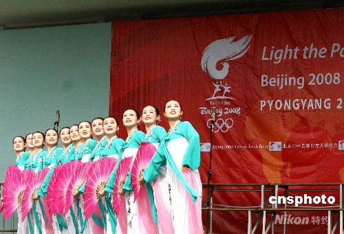 圖為朝鮮藝術(shù)家在慶典儀式上表演節(jié)目祝福北京奧運(yùn)。 中新社發(fā) 沈晨 攝