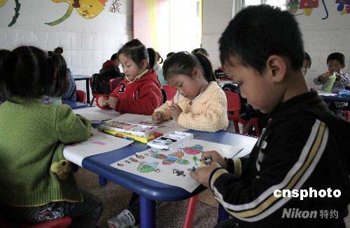四月二十八日下午,安徽省阜陽(yáng)市振潁幼兒園的學(xué)生在上美術(shù)課。安徽省阜陽(yáng)市千余嬰幼兒童感染腸道病毒EV71后,當(dāng)?shù)卣扇∫磺写胧┘訌?qiáng)救治,嚴(yán)守預(yù)防,減少擴(kuò)延,經(jīng)過(guò)有效控制,目前人心安定,社會(huì)各項(xiàng)活動(dòng)有條不紊,小學(xué)、幼兒園學(xué)習(xí)生活如常。中新社發(fā) 張婭子 攝