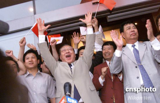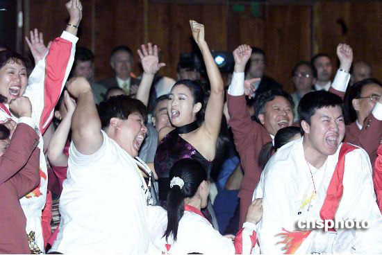 2001年7月13日,在莫斯科世界貿(mào)易中心舉行的國(guó)際奧委會(huì)112次會(huì)議中,北京獲得2008年奧運(yùn)會(huì)舉辦權(quán),代表團(tuán)成員們歡慶勝利。中新社發(fā) 王瑤 攝