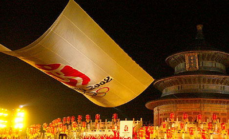 2003年8月3日,第29屆奧運(yùn)會(huì)會(huì)徽“中國(guó)印·舞動(dòng)的北京”發(fā)布儀式在北京天壇祈年殿舉行。(資料照片)