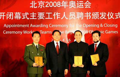 2006年4月16日上午,北京奧組委向第29屆奧運會開閉幕式第一批主要工作人員頒發(fā)聘書,張藝謀任總導演,張繼鋼、陳維亞任副總導演。