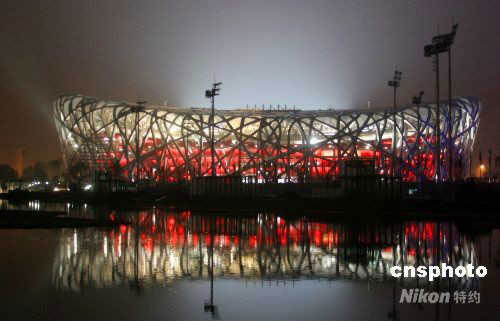 2008年4月10日,北京奧運(yùn)會(huì)主場(chǎng)館“鳥巢”全場(chǎng)亮燈,照亮京城夜空。中新社發(fā) 吳芒子 攝