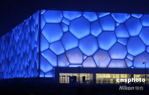 2008年1月19日晚,北京奧運(yùn)工程之一的國(guó)家游泳館(“水立方”)進(jìn)行調(diào)試造型燈光,“水立方”中每個(gè)氣泡被照射上藍(lán)色燈光,令人暢想奧運(yùn)水世界。中新社發(fā) 吳芒子 攝