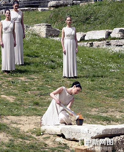 希臘當(dāng)?shù)貢r(shí)間3月24日,北京二00八年奧運(yùn)會(huì)圣火采集儀式在古奧林匹亞競(jìng)技場(chǎng)舉行,最高女祭司用順利采集到火種引燃手中的火炬。中新社記者 王歡 攝