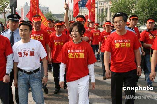 4月30日,北京奧運(yùn)會(huì)迎來開幕倒計(jì)時(shí)100天,天津迎奧運(yùn)萬人健步走活動(dòng)啟動(dòng)。2000年悉尼奧運(yùn)會(huì)競(jìng)走冠軍王麗萍(中)與萬余名天津市民一起,步行4.5公里,宣傳奧運(yùn),祝福奧運(yùn)。 中新社發(fā) 田齊 攝