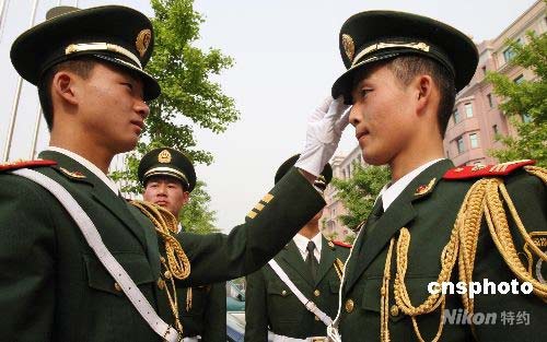 4月30日,北京飯店舉行迎奧運(yùn)倒計(jì)時(shí)100天千人簽字活動(dòng),北京飯店被國(guó)際奧委會(huì)正式確立為第29屆奧林匹克大家庭總部飯店,隨著2008北京奧運(yùn)會(huì)的臨近,飯店開(kāi)展了以?shī)W運(yùn)為目標(biāo)的服務(wù)技能比賽,投入到奧運(yùn)接待服務(wù)工作中。北京飯店千名員工,以及天安門(mén)國(guó)旗護(hù)衛(wèi)隊(duì)、中國(guó)人民解放軍軍樂(lè)團(tuán)參加奧運(yùn)倒計(jì)時(shí)100天儀式。 圖為在北京飯店奧運(yùn)倒計(jì)時(shí)100天儀式上天安門(mén)國(guó)旗護(hù)衛(wèi)隊(duì)?wèi)?zhàn)士整理軍容。 中新社發(fā) 錢興強(qiáng) 攝