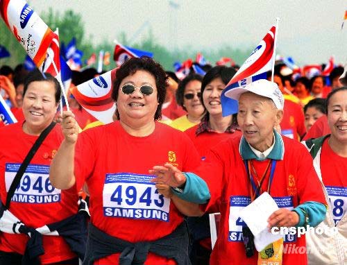北京奧運(yùn)會(huì)倒計(jì)時(shí)100天群眾馬拉松接力活動(dòng)暨2008年北京國際長跑節(jié),4月30日上午在北京國家體育場(chǎng)公共區(qū)隆重舉行。中新社發(fā) 宋吉河 攝